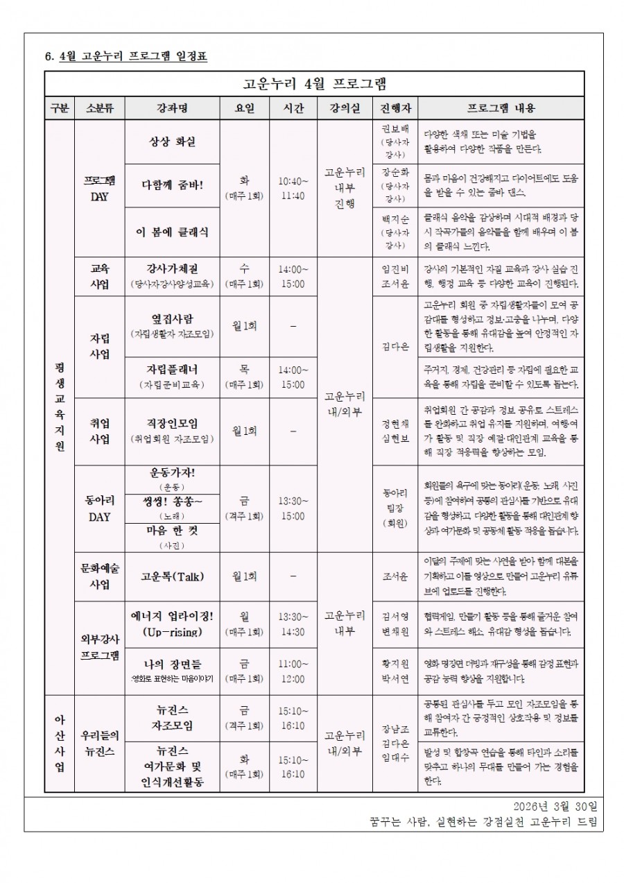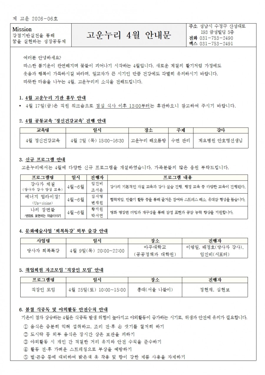 4월의 고운누리 안내문