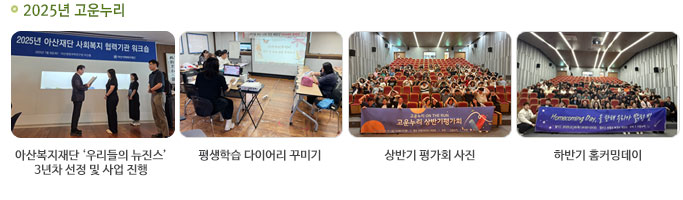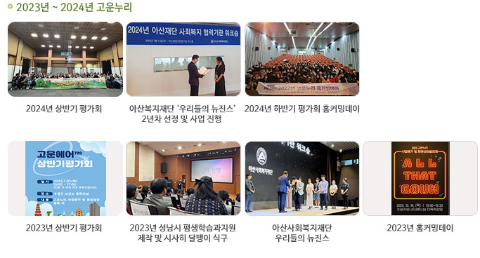 | 2019년 | 2~3월 고운누리 강점기반실천 연수 시행 (평화정신재활시설, 새봄, 사랑밭 참여) 2월 마노스예술교육 사회적협동조합 협약 (프로그램 전문 강사 지원) 3월 해피빈 4월 더블기부 선정(인턴 프로젝트) 4월 성남시 평생학습원 특성화 프로그램 지원 사업 선정 (푸른영화 아카데미 시즌2) 5월 해피빈 신한가족 만원 나눔 공모 선정(노크특공대) 8월 동료지원 활동가 워크샵 진행 |