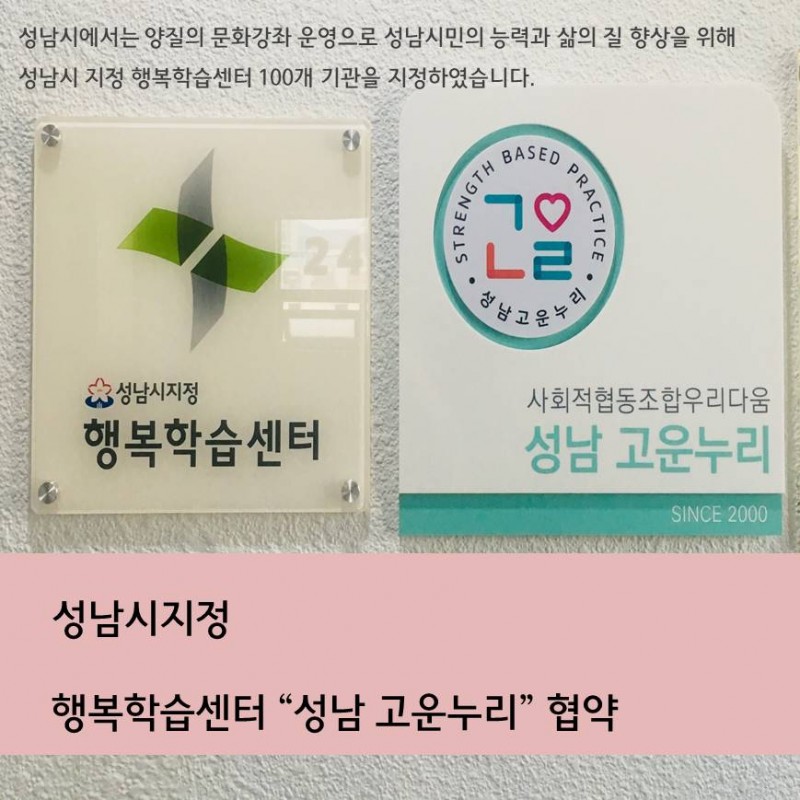 성남시에서는 양질의 문화강좌 운영으로 성남시민의 능력과 삶의 질 향상을 위해 성남시 지정 행복학습센터 100개 기관을 지정하였습니다.