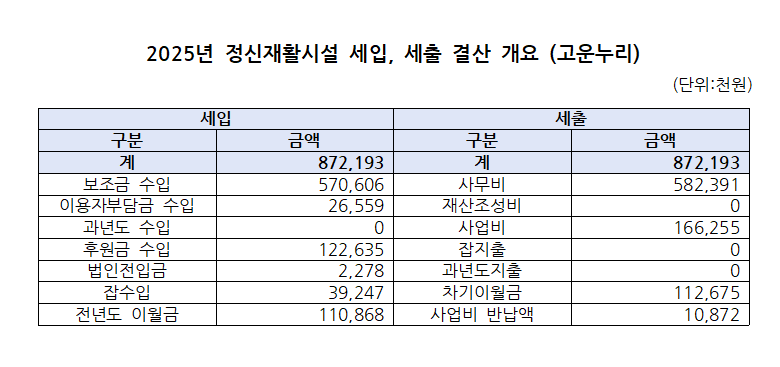 사회복지법인 및 사회복지시설 재무회계규칙 제10조 4항, 제19조 2항에 의거하여 고운누리 2025년도 결산을 위와 같이 공고합니다.