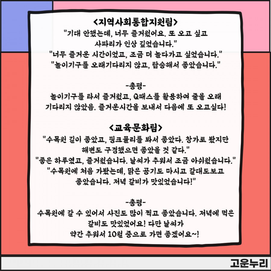 | [소식지] No10. 2023년 고운누리 10번째 카드뉴스 "고운누리 회원들의 팀별 나들이!" | |||||