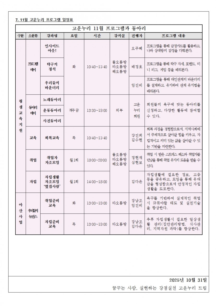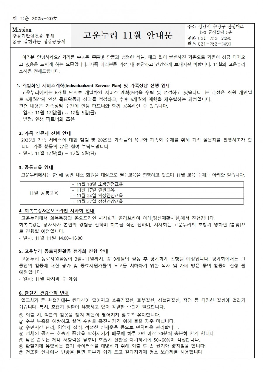 11월의 고운누리의 소식을 전합니다.