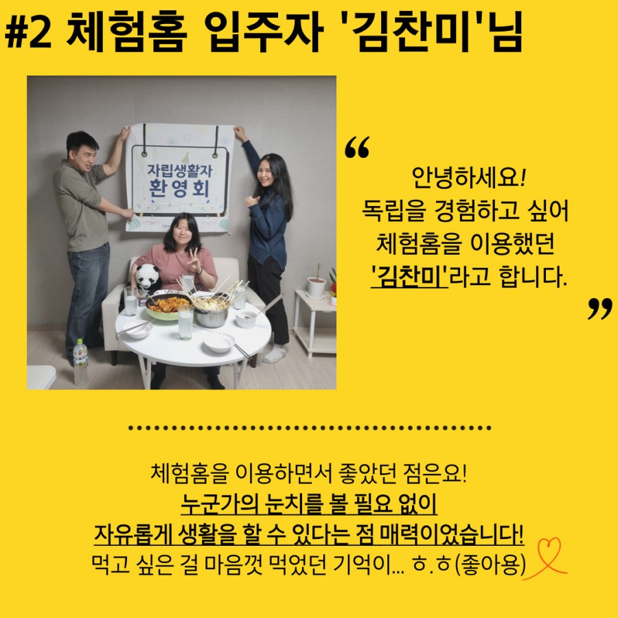 안녕하세요! 이번 고운누리 소식지 주제는 '체험 홈' 입니다! 2023년부터 아산사회복지재단의 후원 사업으로 고운누리 회원들의 자립을 위해 체험 홈을 운영하고 있는데요! 꽁꽁 숨겨두었던 고운누리의 체험 홈은 과연 어떤 모습일지 궁금하시죠? 그래서 콘텐츠 개발 교육팀이 직접 취재를 다녀왔습니다! 랜선 집들이와 함께 자립 훈련을 위해 직접 거주한 회원의 이야기를 같이 한 번 들어보시겠어요?